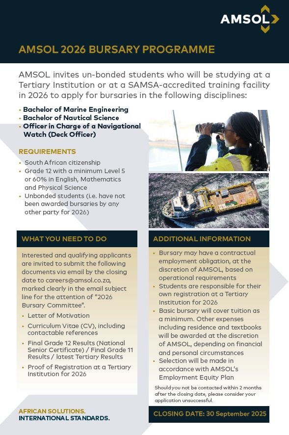 Successful candidates may also be offered employment opportunities with AMSOL after graduation, based on operational requirements. This makes it not just a bursary but also a potential pathway to secure work in South Africa’s thriving maritime industry.