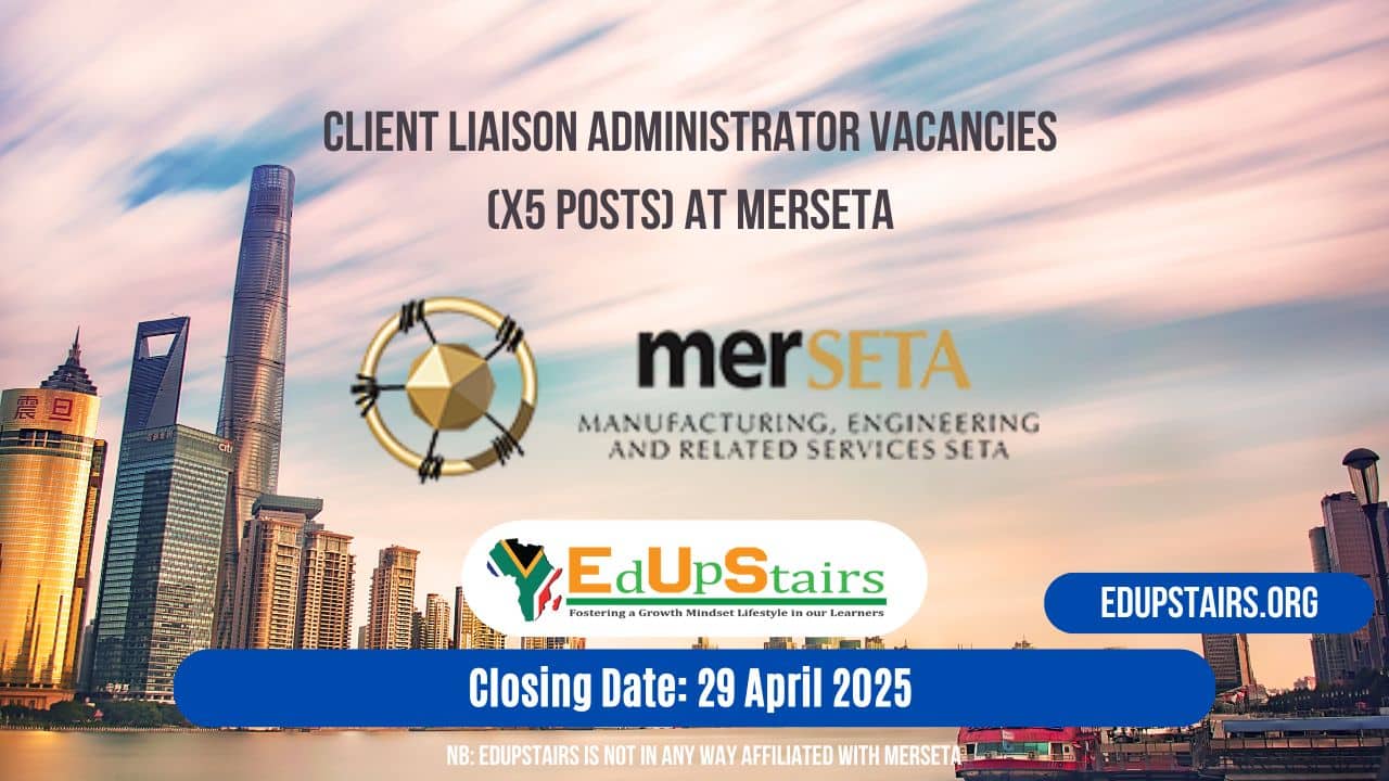 The Manufacturing, Engineering and Related Services Education and Training Authority (merSETA) invites suitably qualified applicants to apply for their Client Liaison Administrator Vacancies (X5 Posts). The closing date for applications is the 29th April 2025