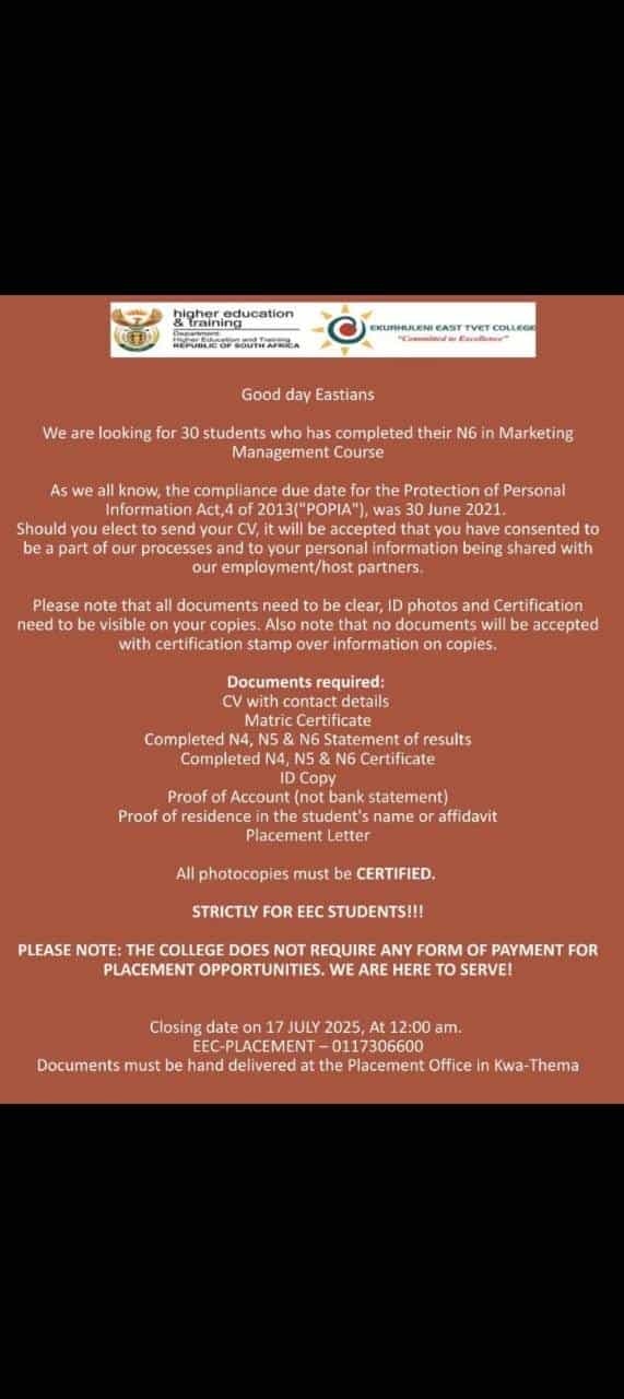 DOWNLOAD THE EKURHULENI EAST TVET COLLEGE N6 MARKETING MANAGEMENT GRADUATE PLACEMENT PROGRAMME ADVERT HERE