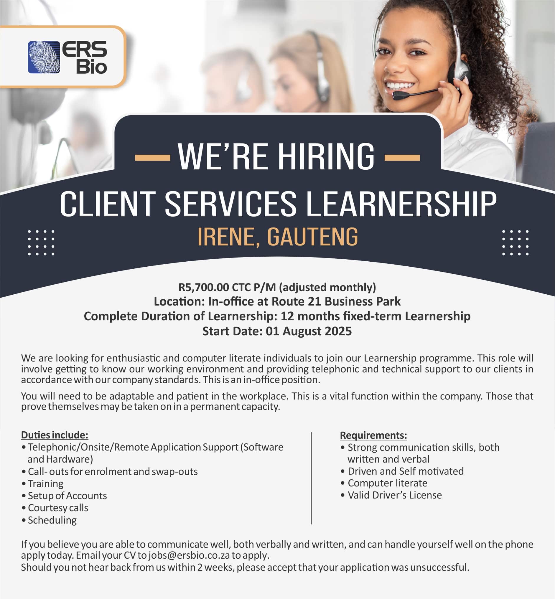 The ERS Biometrics Client Services Learnership Programme is a structured, work-based learning experience combining theoretical training and practical, on-the-job application. The programme is tailored for candidates interested in developing skills in customer support, product troubleshooting, and client relationship management—particularly within the tech and biometrics industry.