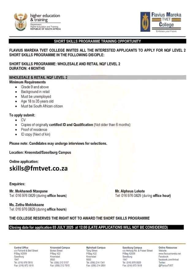 In an inspiring move aimed at tackling unemployment and improving skills among South Africans, Flavius Mareka TVET College, in collaboration with the Wholesale and Retail Sector Education and Training Authority (W&RSETA), is rolling out a Short Skills Training Programme pegged at NQF Level 2. This initiative is designed specifically for unemployed youth and individuals seeking to gain entry-level skills in the wholesale and retail sector — one of the largest employment sectors in South Africa.