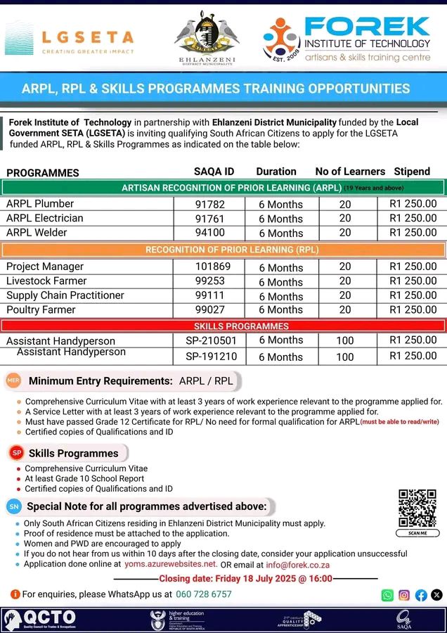 Applicants should be South African citizens between the ages of 18–35 and must provide proof of residence and a certified copy of their ID. While no previous experience is required, candidates with a passion for hands-on work will have an advantage.