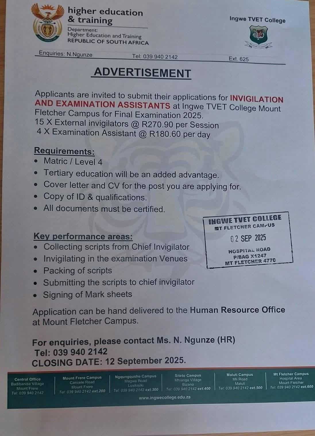 Ingwe TVET College is opening the door for dedicated individuals to play a critical role in supporting the smooth running of the Final Examination 2025 at the Mount Fletcher Campus. The college is inviting applications for 15 External Invigilator posts and 4 Examination Assistant posts, giving community members a chance to contribute to upholding the integrity and efficiency of the assessment process.