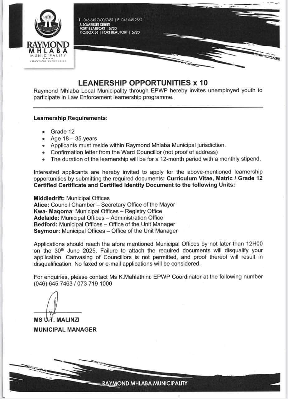 Raymond Mhlaba Municipality continues to lead by example in creating meaningful opportunities that contribute to both community development and youth empowerment. The Law Enforcement Learnership Programme is not just a job opportunity—it’s a platform for change.
