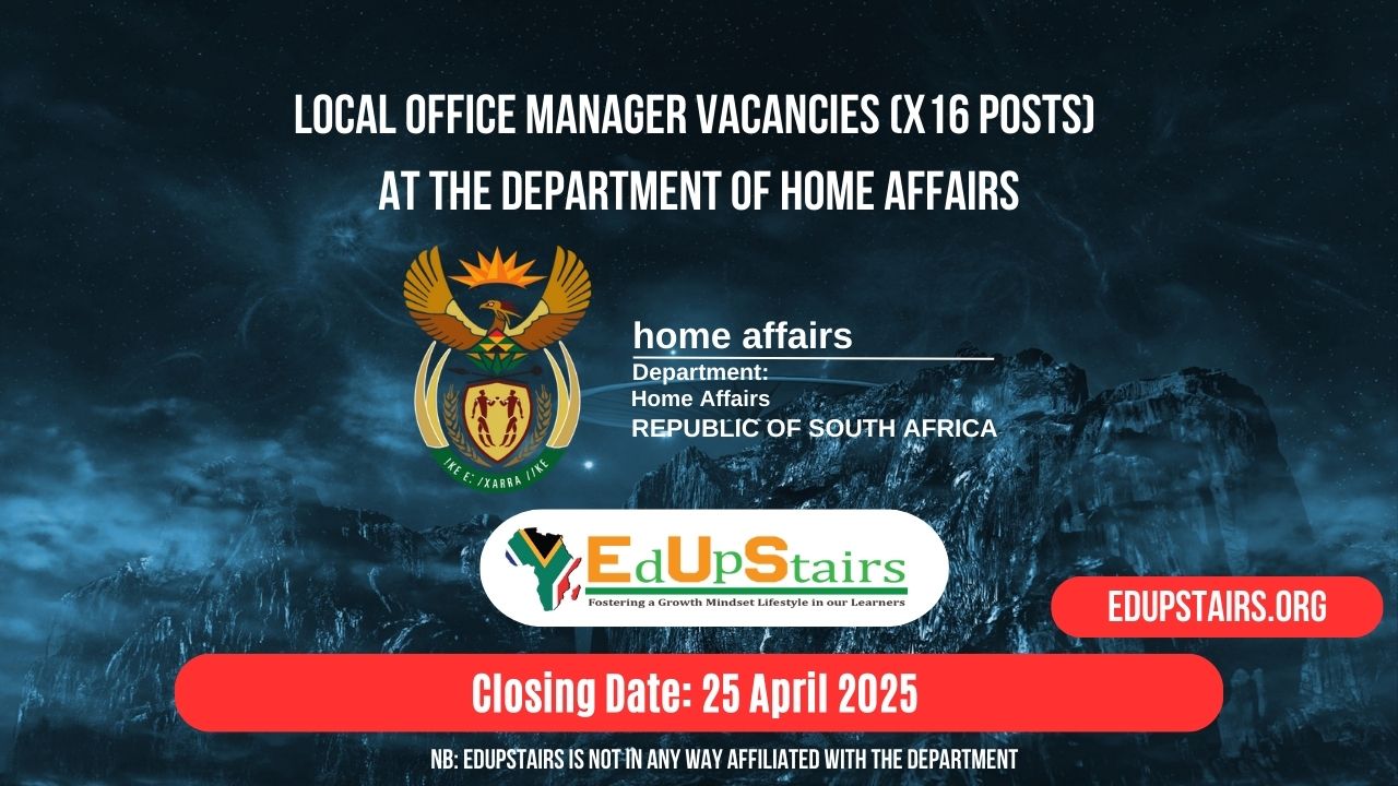 The Department of Home Affairs invites suitably qualified applicants to apply for their Local Office Manager Vacancies (X16 Posts). The closing date for applications is the 25th April 2025