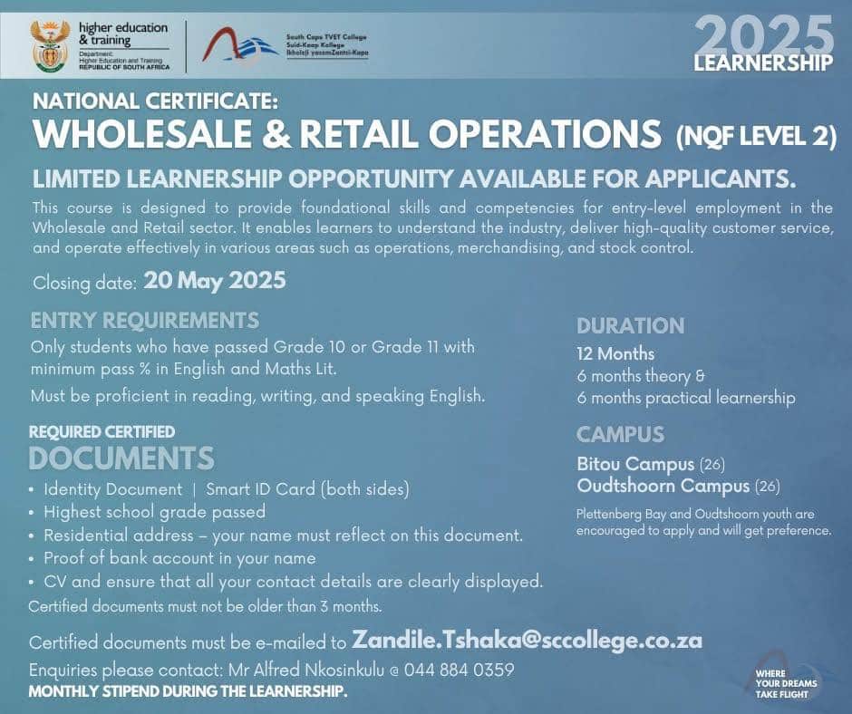 South Cape TVET College invites suitably qualified applicants to apply for their National certificate: Wholesale and Retail Operations Learnership Programme. The closing date for applications is the 20th May 2025