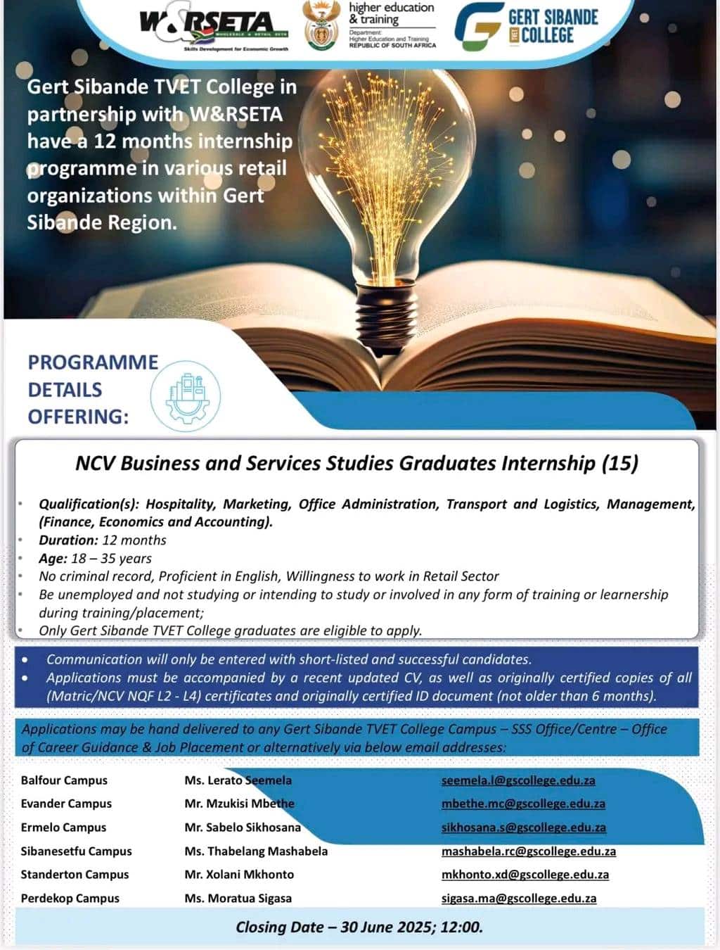 Applications may be hand delivered to any Gert Sibande TVET College Campus — SSS Office/Centre — Office of Career Guidance & Job Placement or alternatively via below email addresses: