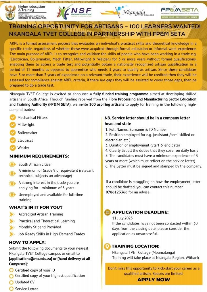 DOWNLOAD THE NKANGALA TVET COLLEGE ARTISAN TRAINING PROGRAMME ADVERT HERE