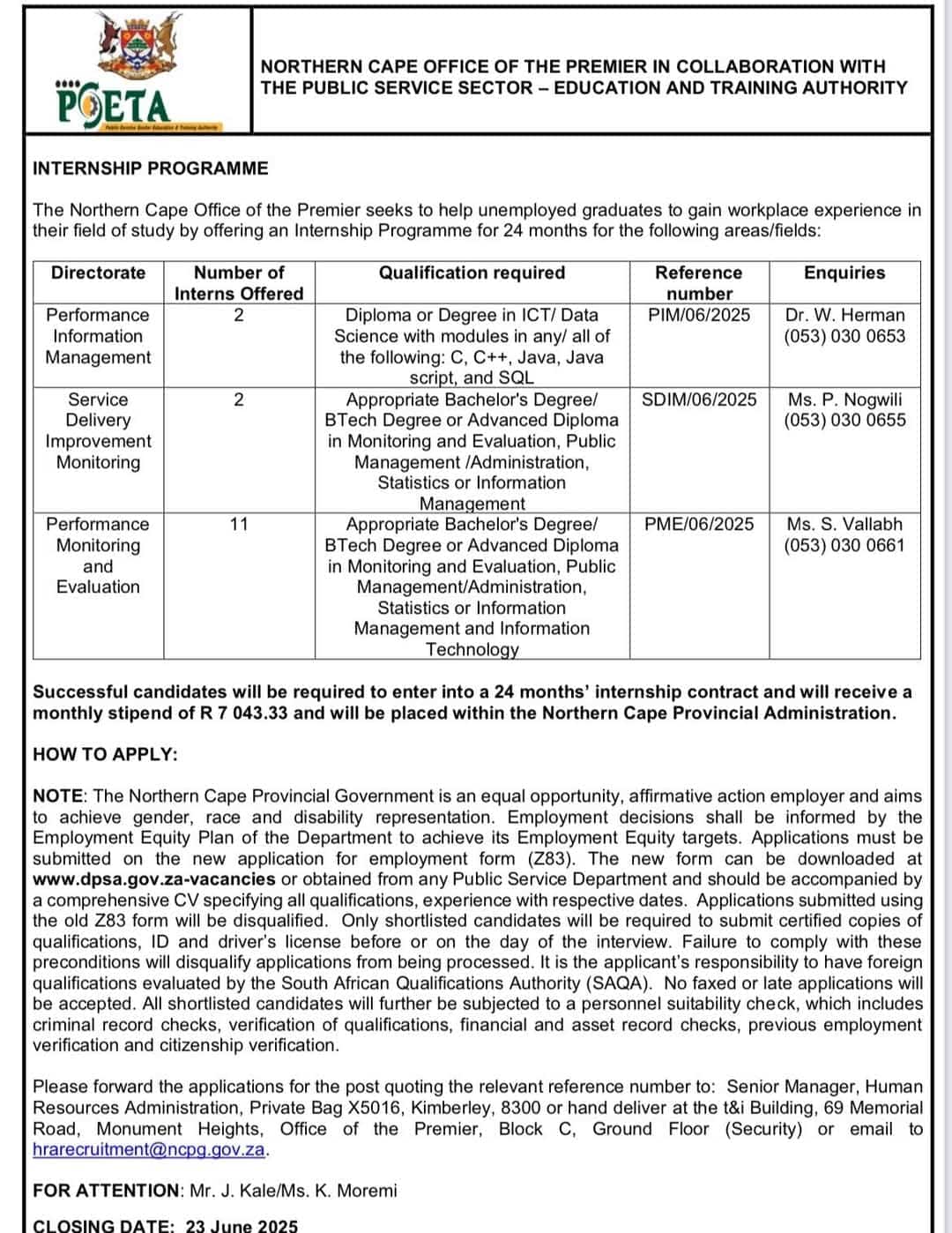 Successful candidates will be required to enter into a 24 months’ internship contract and will receive a monthly stipend of R7 043.33 and will be placed within the Northern Cape Provincial Administration.