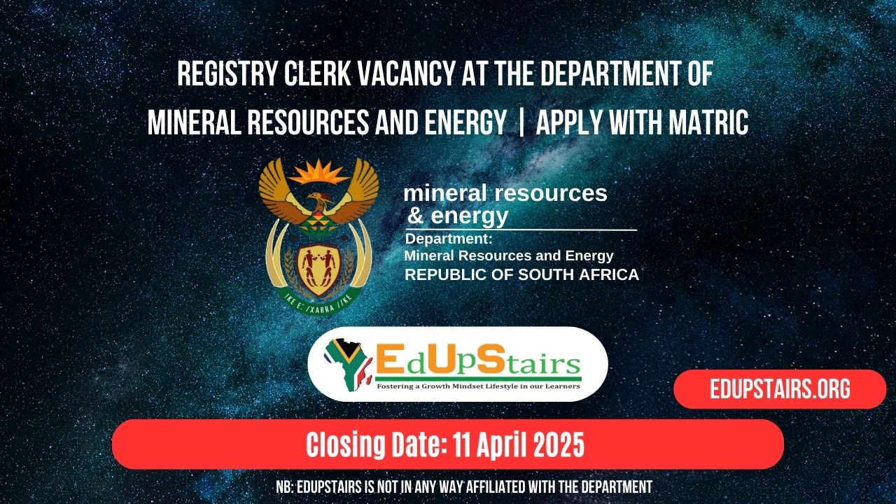 The Department of Mineral Resources and Energy invites suitably qualified applicants to apply for their Registry Clerk Vacancy. The closing date for applications is the 11th April 2025