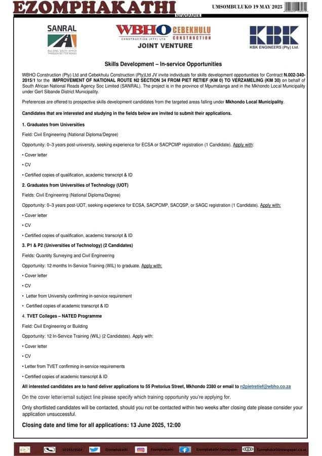 WBHO Construction and Cebekhulu Construction invites individuals for skills development opportunities for contract N.002-340-2015/1 for the Improvement of National Route N2 Section 34 From Piet Retief (KM 0) to Verzameling (KM 30) on behalf of the South African National Roads Agency (SANRAL). The project is in the province of Mpumalanga and in the Mkhondo Local Municipality under Gert Sibande District Municipality.