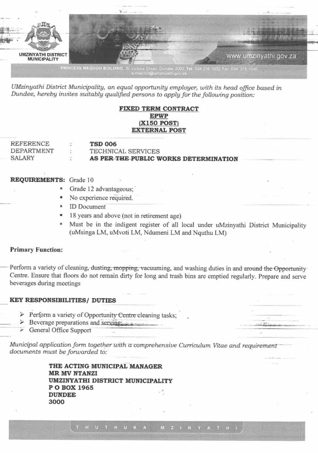 DOWNLOAD THE UMZINYATHI DISTRICT MUNICIPALITY EPWP ADVERT HERE