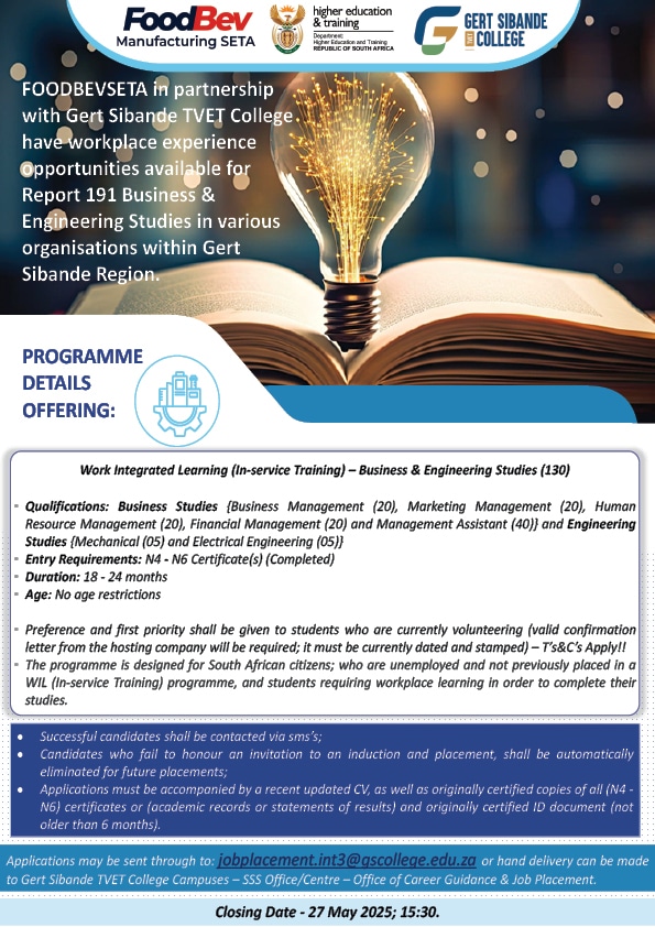 FoodBev Seta in partnership with Gert Sibande TVET College have workplace experience opportunities available for Report 191 Business & Entering Studies in various organisations within Gert Sibande Regions. The closing date for applications is the 27th May 2025